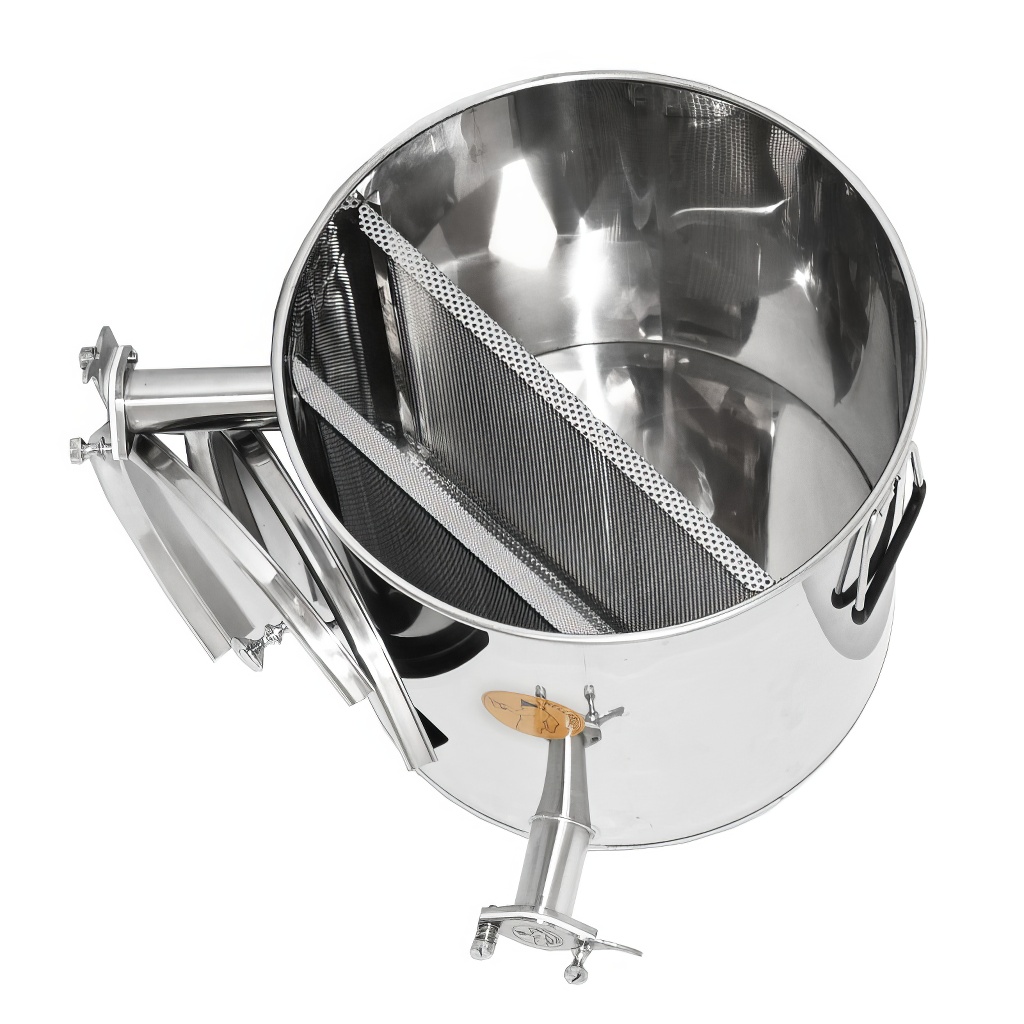 The internal arrangement of the sieves ensures maximum permeability. The first sieve with coarse mesh is placed as close as possible to the center of the container, so that it has the largest possible surface area. This is followed by a sieve with fine mesh for perfect straining of honey from even the smallest impurities. The 50 l and 60 l containers are also equipped with an extended upper drain cock so that you can conveniently place another container underneath. The 50 l variant is height-selected to fit under most of the honey extractors we offer.