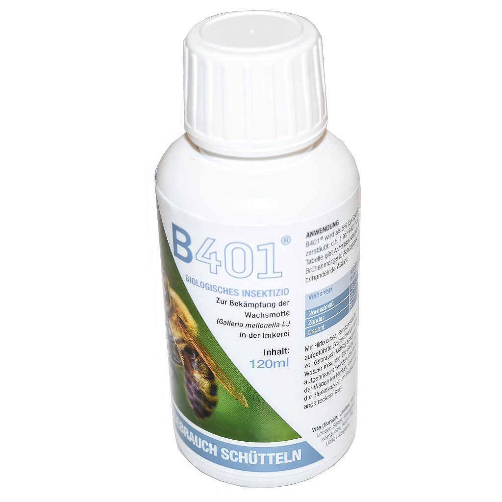 Bacillus thuringiensis contained in the B401 solution was discovered in 1911. It produces spores containing a toxin that is released inside the wax moth larva, killing it. Adult moths do not feed and therefore are not affected by this product. B401 is harmless to vertebrates and bees, and leaves no residues in wax and honey.