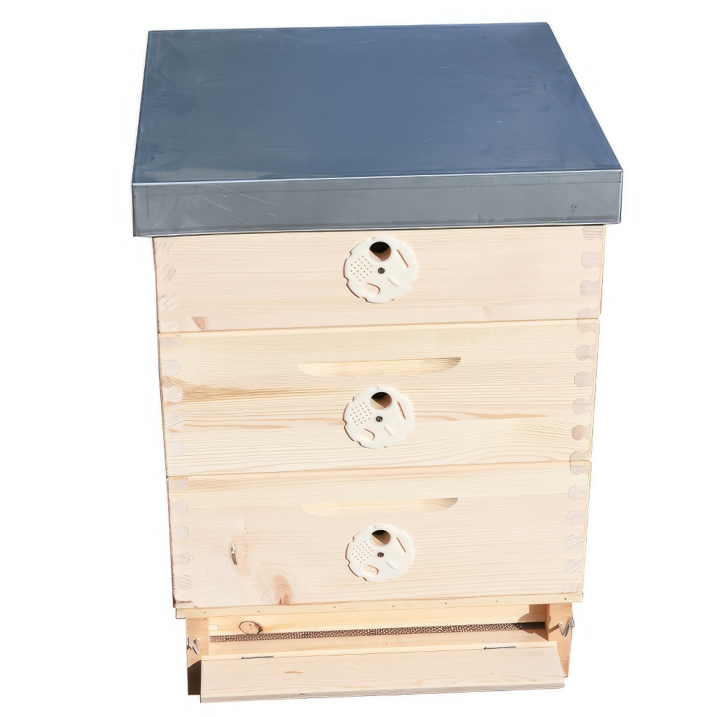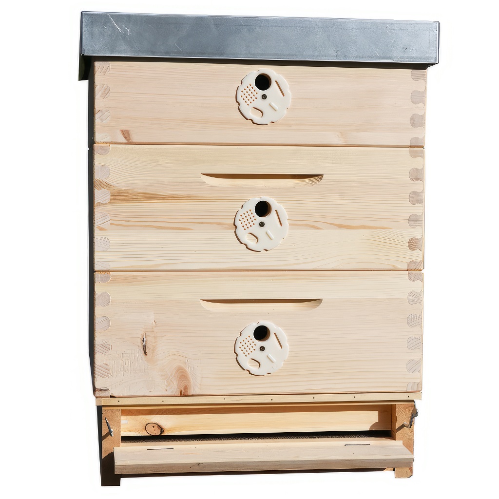B10 beehive set with three shallow supers. Suitable for nucleus colonies. Ideal for overwintering, but in spring you will need to expand with additional supers. This set can hold 30 frames of 42x17 size.