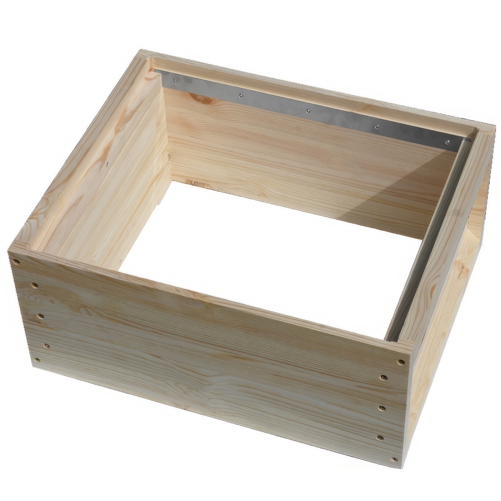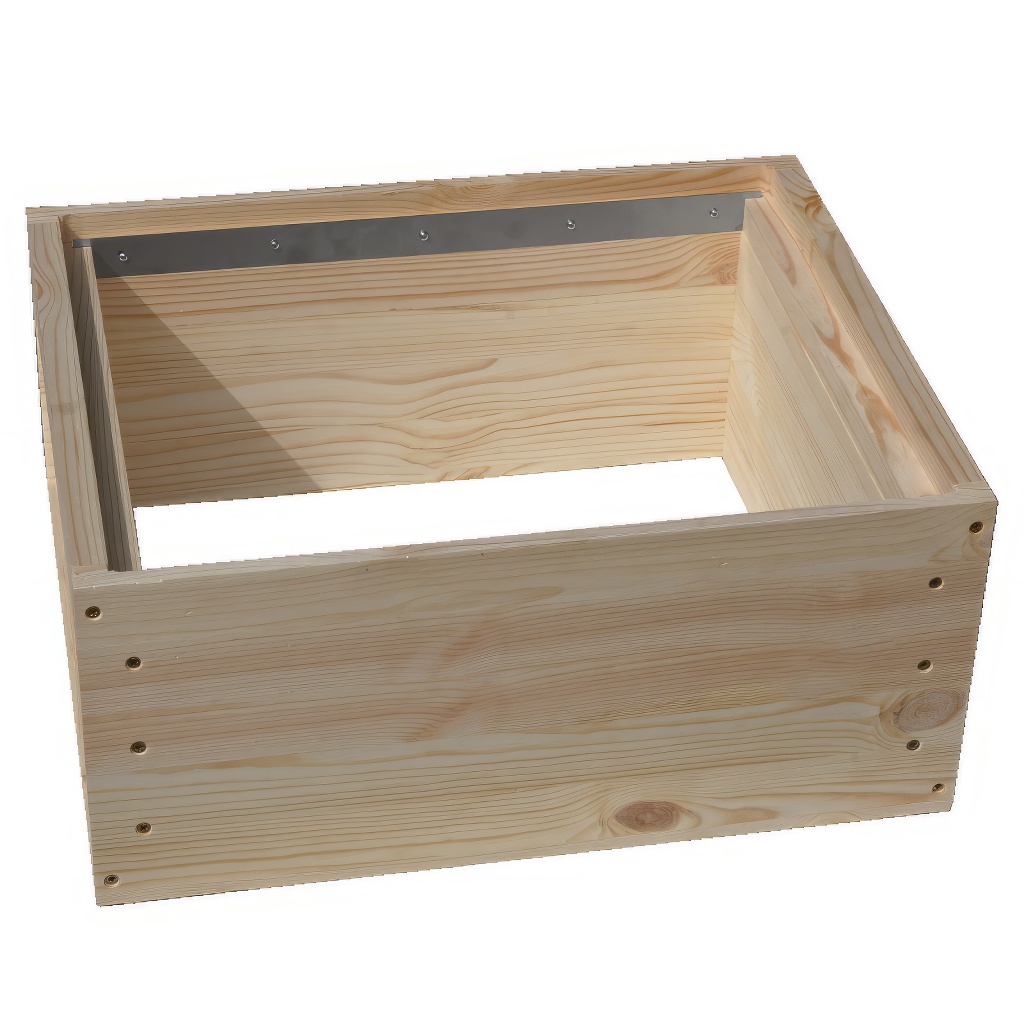 This hive is suitable for 12 German standard frames in cold configuration with rails. It is made of 20mm thick wood and has multiple layers of glue. The stability is further supported by a rabbet joint at the corner connection. Two slats attached to the bottom protect the boxes from slipping. Two handle strips ensure very good handling. Wood exposed to weather should always be treated with a protective coating. With permanently mounted stainless steel support rails for 12 standard frames measuring 394 x 223 mm