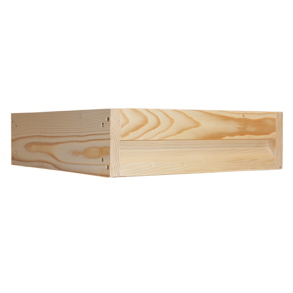 This hive is suitable for 10 German standard frames in cold configuration. It is made of 20mm thick wood and glued multiple times. The stability is further supported by a rabbet joint at the corner connection. Two slats attached to the bottom protect the supers from slipping. Two handle slats ensure very good handling. Wood exposed to weather should always be treated with a protective coating.