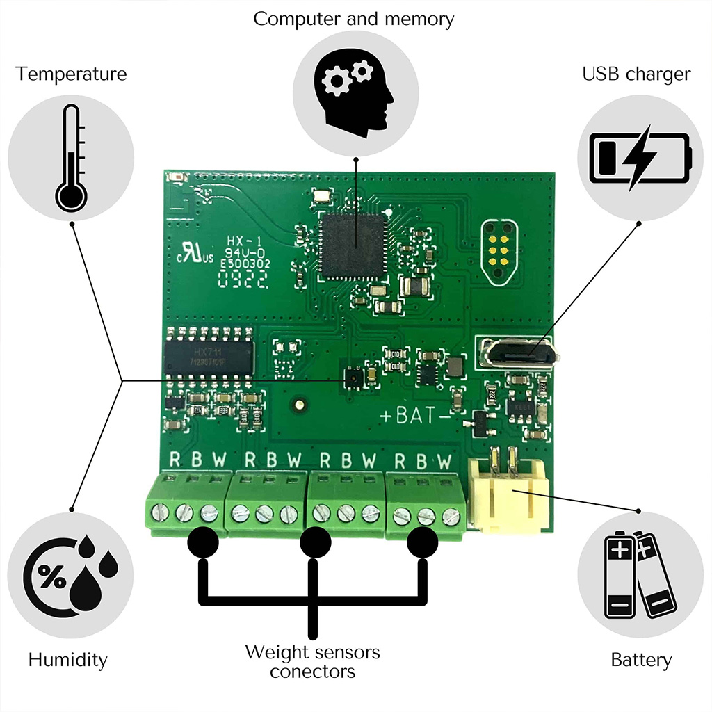 | Monitored parameters | Weight, outdoor temperature, outdoor humidity (optional when housing is perforated), estimated number of flying bees |