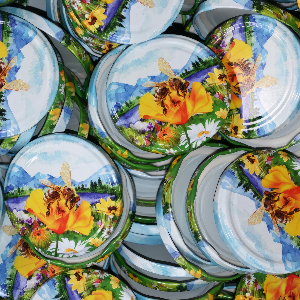 Nice cheerful lids that decorate your honey glass. It is a lid with screw Twist 82 for a lot of jars with 82 mm throat. The whole package contains 700 pieces.
