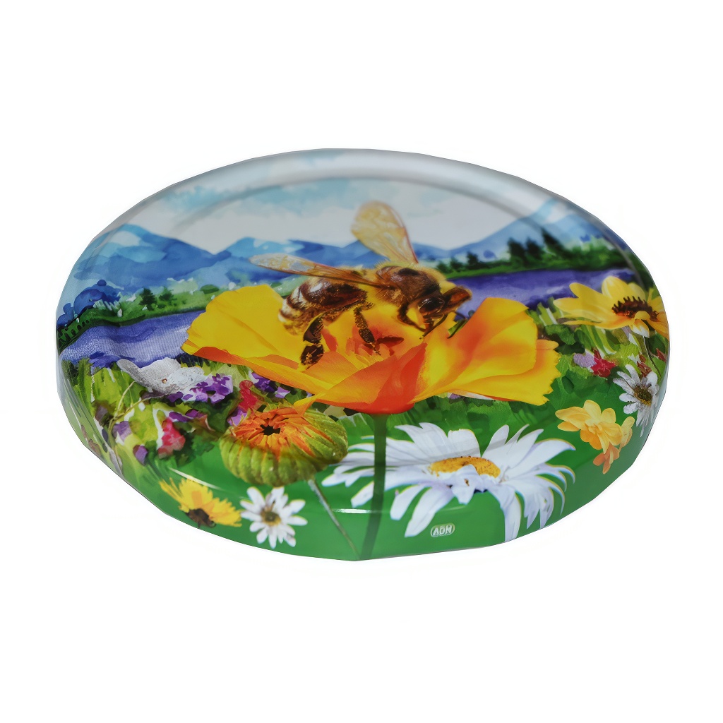 The screw cap with mountain meadow motif is designed for commonly used jars for bottled honey: Včela 730 ml, Facette 720 ml, Fass 720 ml, Facette 580 ml, and Facette 420 ml. The design is graphically well-executed and looks very presentable on standard honey jars – whether you sell from your farm, at markets, or supply to stores. The package contains 700 pieces.