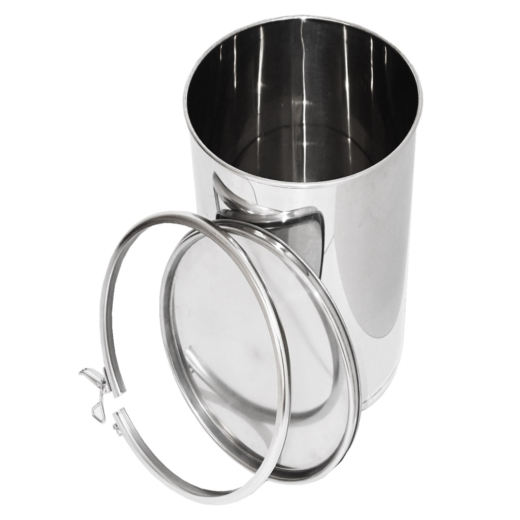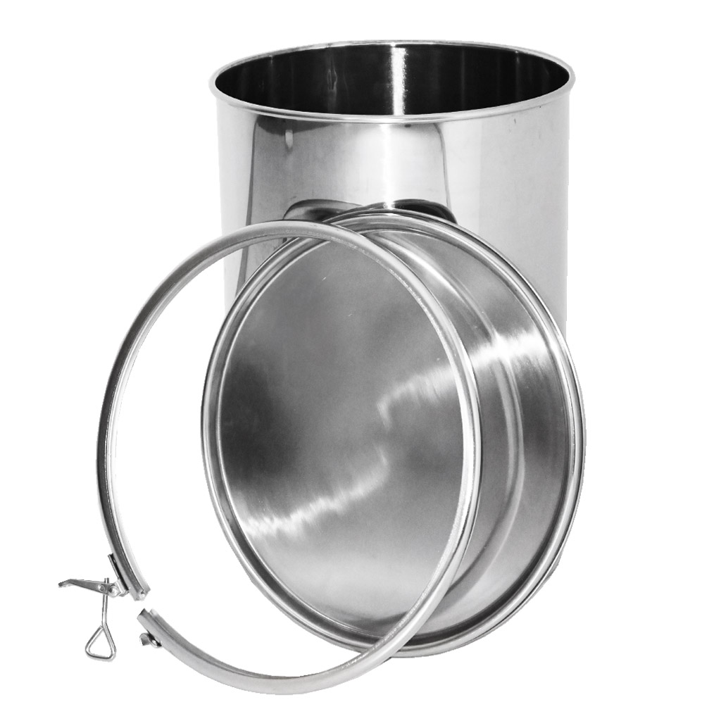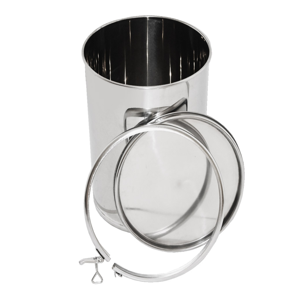 High-quality stainless steel container for honey storage. Equipped with a sealing lid and hooks for secure fastening of the lid to the container. When empty, the containers are stackable. They are manufactured from high-quality food-grade stainless steel of sufficient thickness (0.8 to 1 mm), so that unwanted dents cannot easily occur. All parts of the containers are quality welded using plasma welding. The construction emphasizes smooth surfaces that are easy to clean, therefore the containers are made from polished stainless steel sheets. All our containers are equipped with stainless steel handles for easy carrying. Dimensions: height 55 cm, diameter 30.5 cm. .