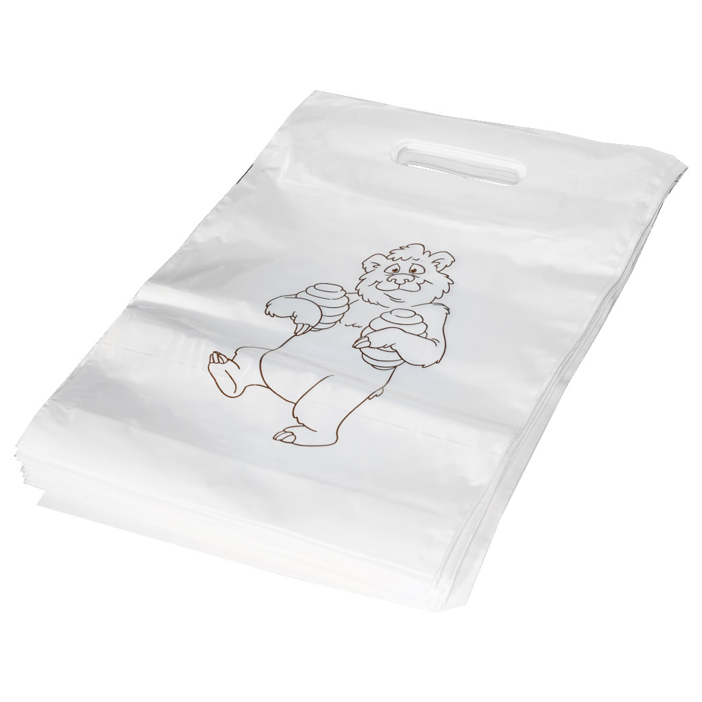 Plastic bags with a bear motif, packed in 50 pieces. Size approx. 30×35 cm.
