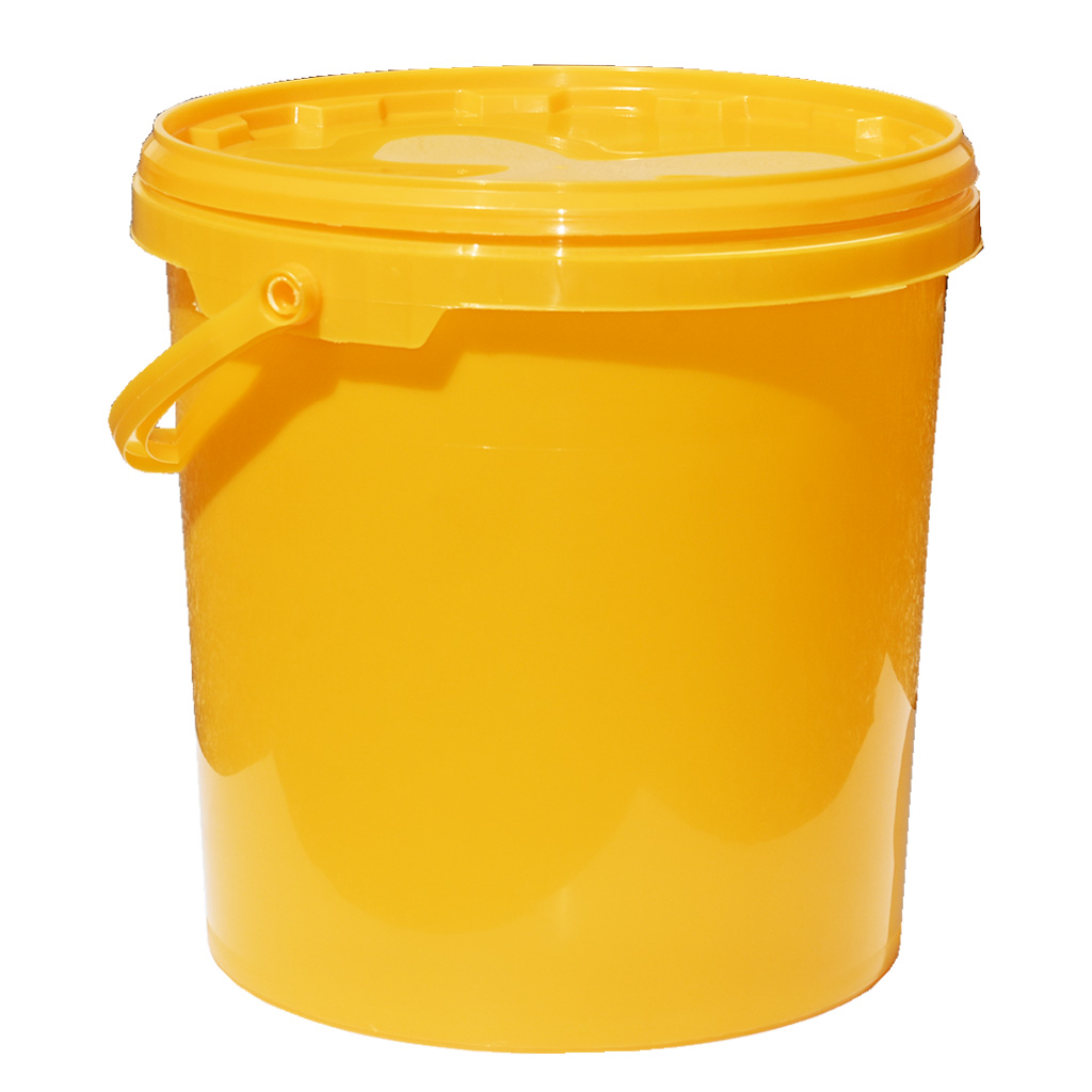 The yellow plastic honey container with lid has a capacity of 14 kg. Plastic honey containers are made of smooth and easily washable plastic. Thanks to the quality construction, high durability, resistance and strength during handling are ensured. The plastic honey container is a suitable alternative to aluminum honey cans. The containers are ideal for both storage and honey trade. The bucket capacity is 14 kg of honey and the material from which the container is made is approved for use in the food industry. The height is 26.5 cm, upper diameter 26 cm. The bottom diameter of the container is 22 cm. ISO volume of the container is 10.7 l.