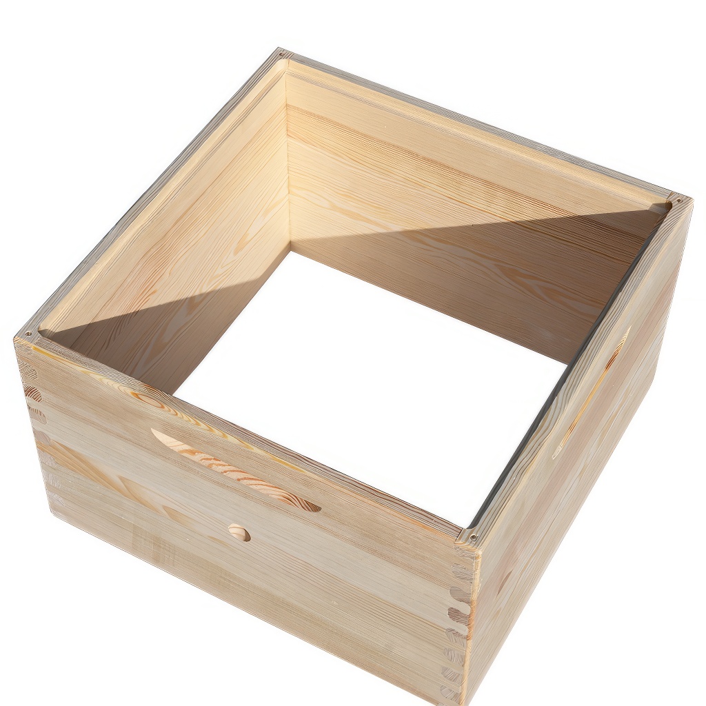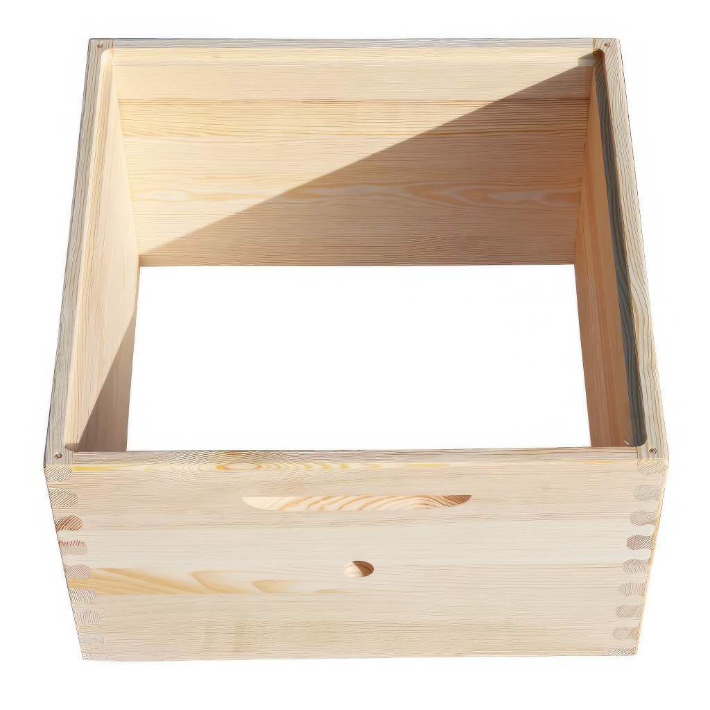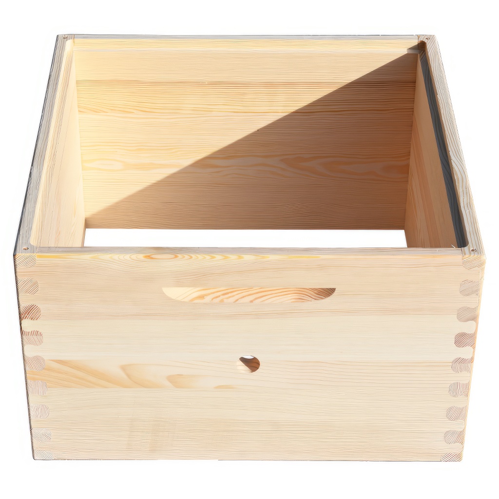 The material used for the supers is finger-jointed Nordic pine. The finger-jointed boards are glued with waterproof D4 adhesive. The supers have a milled rabbet for inserting frames around the entire perimeter. The super is suitable for both warm-way and cold-way frame orientation. The corners of the super are formed with half-covered dovetail joints (finger joints). The outer edges are rounded with a radius of R5. The super has no rabbet around the perimeter, which allows for easy stacking of supers and minimizes crushing bees.
