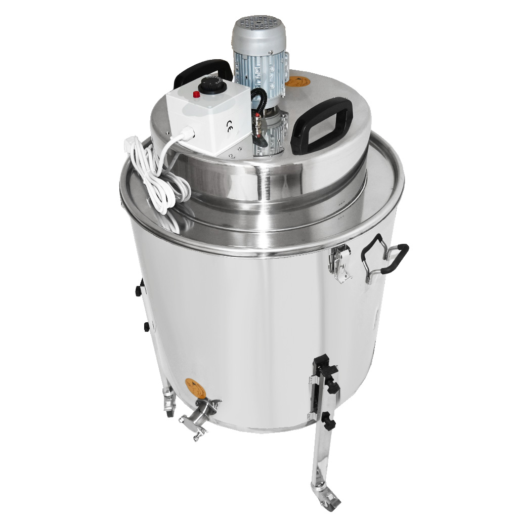 For maximum yield, the container is designed with a sloped bottom and outlet with a gate valve at the lowest point, so minimum residue remains and even the last honey flows out.