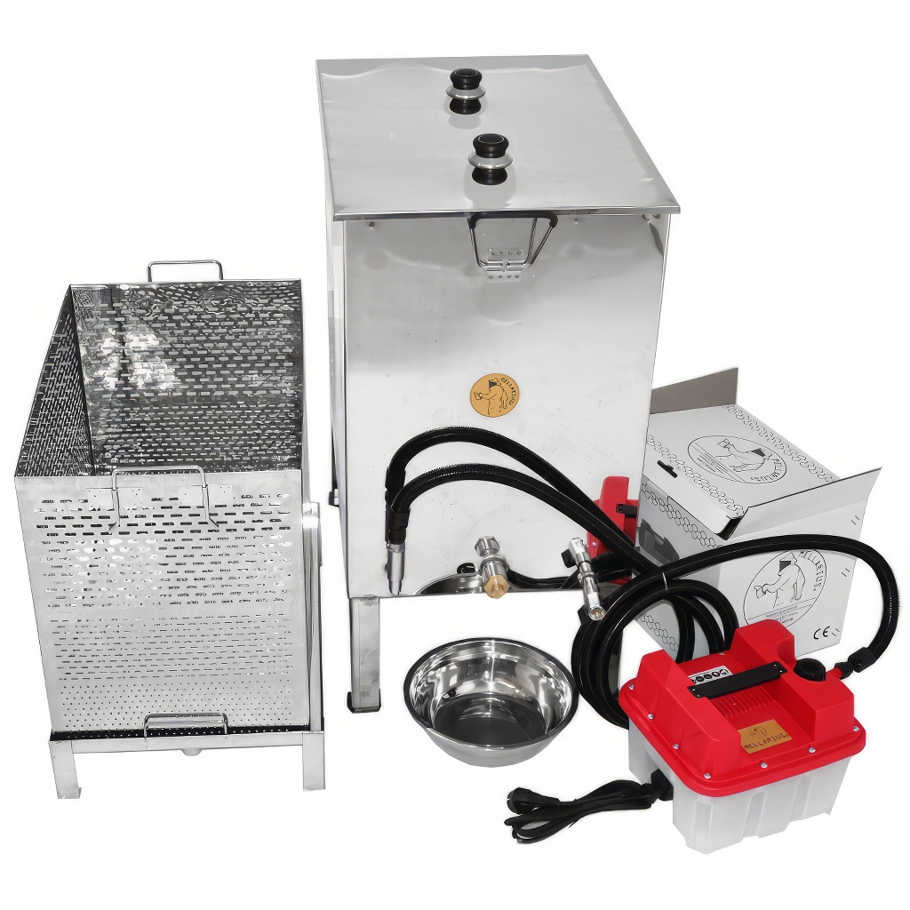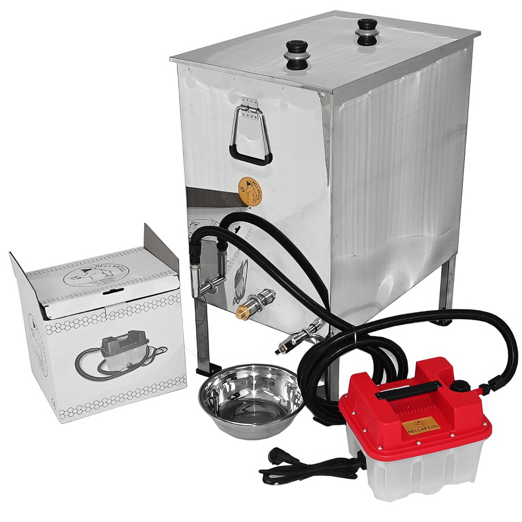 We supply a complete set ready to use: 1× stainless steel wax melter, 1× stainless steel internal sieve for catching impurities, 1× steam generator 2.2 kW, 1× stainless steel wax mold (bowl) 2.5 l, 1× reduction for connecting the steam generator and 1× brass plug for operation on a gas burner or for disinfection bath mode.