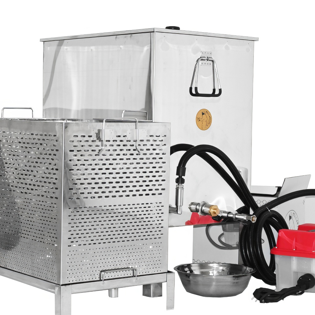Regular comb replacement is one of the basics of proper zoo-hygiene and helps reduce the pressure of diseases such as American foulbrood or nosemosis. The internal basket with a capacity of up to 18 frames significantly reduces the number of cycles and saves your time. Steam melting effectively separates clean wax from cocoons and at the same time acts with high temperature, which helps sanitize frames. Water and melted wax are drained through separate outlets, so you get clean wax suitable for further processing (e.g. for foundation or cosmetics). Using the supplied brass plugs, the device can also be used as a disinfection bath for selected beekeeping equipment.