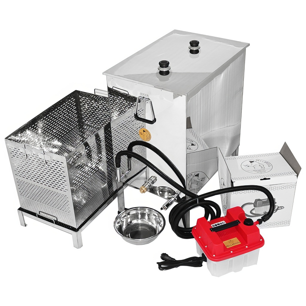 The Mellarius melter is made of food-grade stainless steel with a thickness of 0.8 to 1 mm, which resists deformation well and can handle intensive use. Plasma welding and emphasis on smooth surfaces facilitate cleaning and reduce dirt adhesion. Stability is ensured by massive, firmly welded legs with four-point support. Inside you will find a removable basket with handles, placed on a stainless steel plate that separates the water circulation from the space for draining wax.